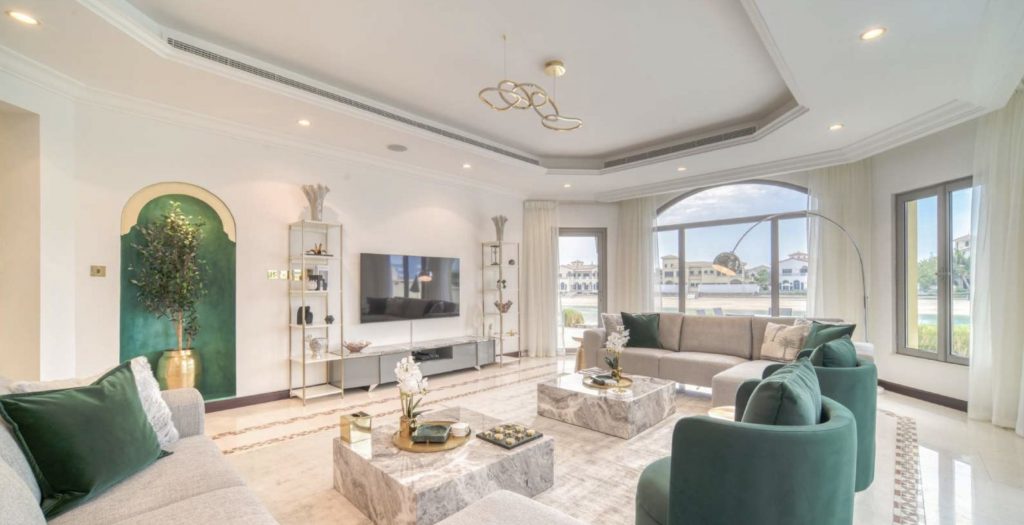 Plush sectional sofas in woolly beige fabric adorned with delta green pillows enhance your viewing experience as you watch TV or enjoy the magnificent Palm Jumeirah views from your balcony or terrace. For an entirely different experience, you might want to cool off in the private pool or marvel at the lush gardens outside, which are filled with vibrant flowers and greenery. Feeling hungry? No problem, the kitchen is stocked with all the necessary appliances for a quick meal or to prepare something from scratch if you wish.