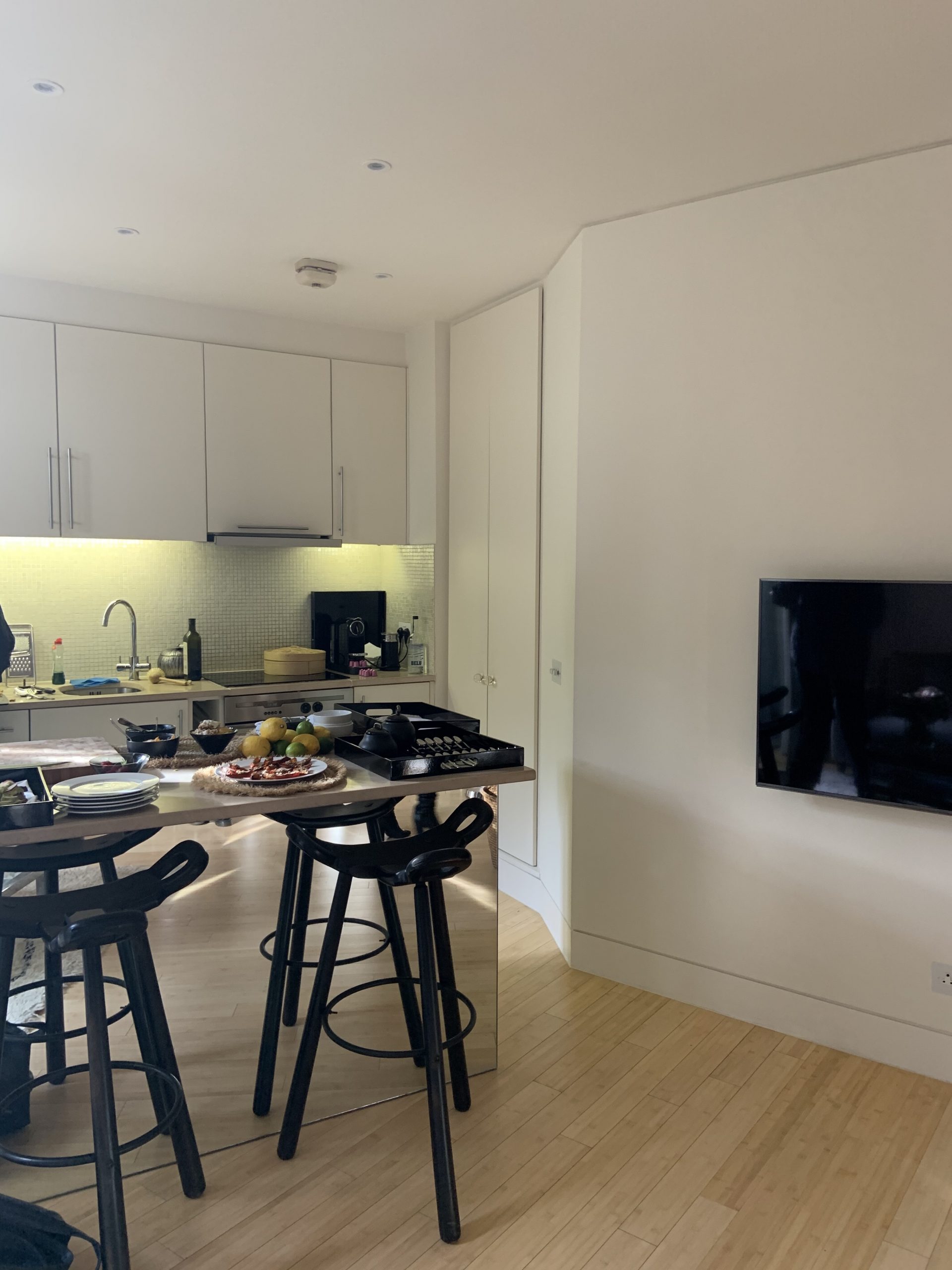 The brightness continued through to the open plan kitchen/dining/living area at the opposing end of the corridor. White walls coincided with tasteful touches of design, from the freestanding Tom Dixon spiral light to the luxe coffee table photography books. Yet practicality had not been sacrificed at the expense of the delightful decor. The velvet 3-seater sofa and glass dining table were stylish and functional in equal measure. A sizeable desk area, wall mounted smart TV and Marshall Bluetooth speaker demonstrated that the needs of both business and leisure travellers had been carefully considered.